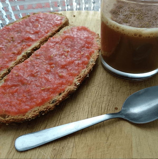 ¡Pan con aceite y tomate! Yo trituro varios tomates y lo guardo en un bote de cristal para tener varios días. No hay ninguna magia aquí, todas sabéis hacerlo. Es tan simple como tostar el pan, añadir el aceite, el tomate triturado y sal. Aparte, yo tomo café con leche de soja y un pelín de azúcar. Quería traer esta pequeñita receta, como dije porque es mi favorita, pero también porque creo que a veces buscamos recetas y todas son muy difíciles, nos comemos mucho la cabeza y nos olvidamos de estas que son muy sencillas, ricas y baratas.